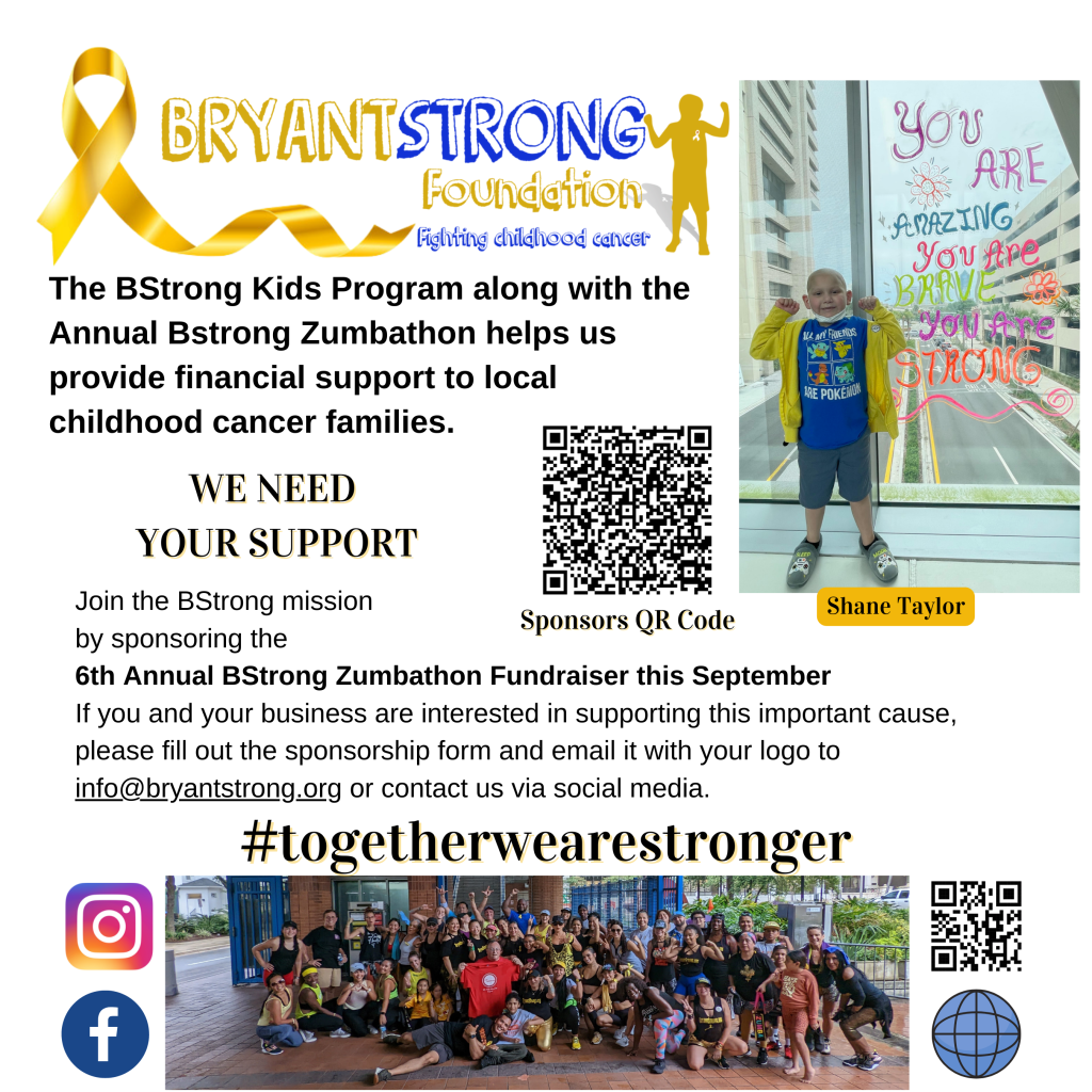 The BStrong Kids Project allows us to bring the community together for a good cause. We raise awareness and hold fundraisers to provide financial aid to local children that are currently battling cancer and their families on the front line. This program is specifically for children under 18 yrs old that have recently been diagnosed, taking cancer treatments locally and are within the 5 year mark of remission. You will receive: